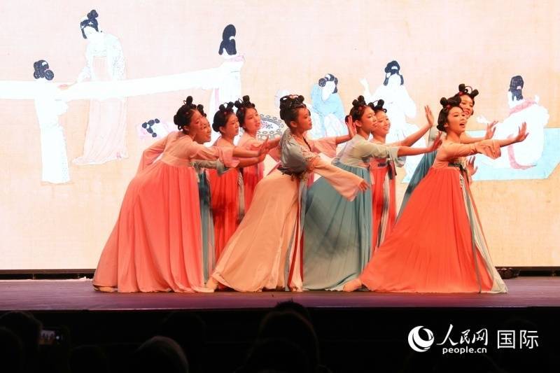 在晚会上,华盛顿地区的华侨华人进行了形式多样的文艺演出。图为演员们表演舞蹈《捣练图》。人民网记者 李志伟摄